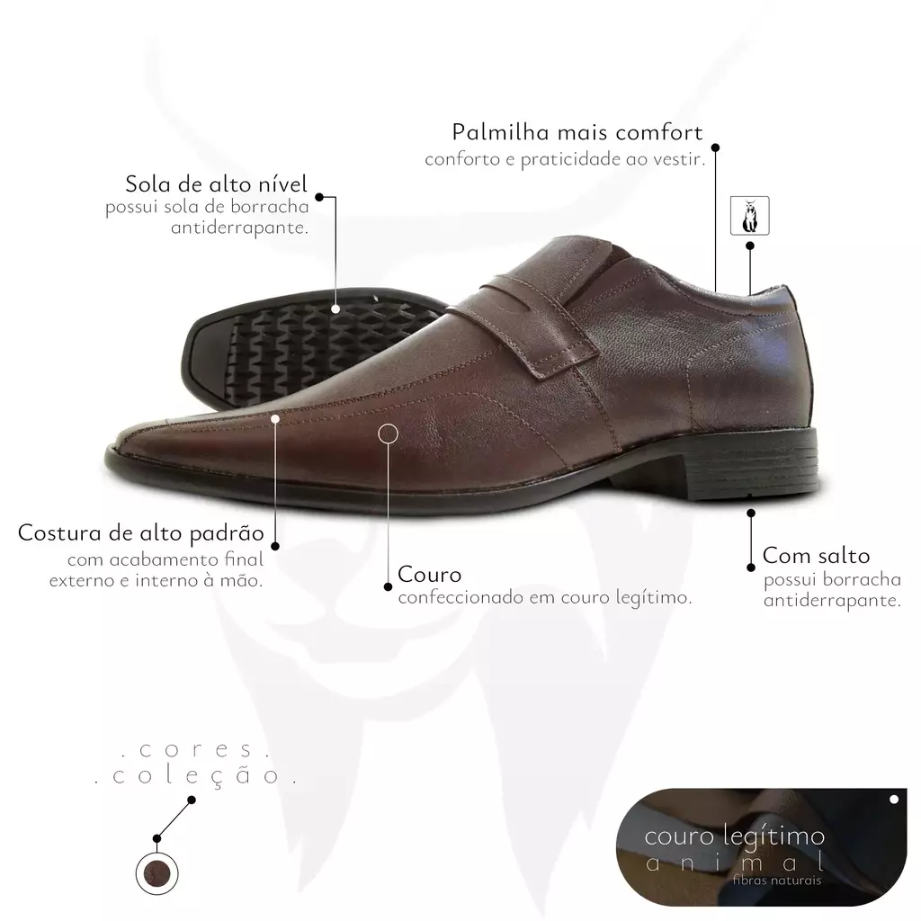 Seja para um look clássico e elegante ou para adicionar um toque de modernidade a calças mais curtas, este sapato é versátil e atende a todas as suas necessidades de estilo. A tonalidade café confere sofisticação, tornando-o um item coringa para estar bem vestido em qualquer ocasião.